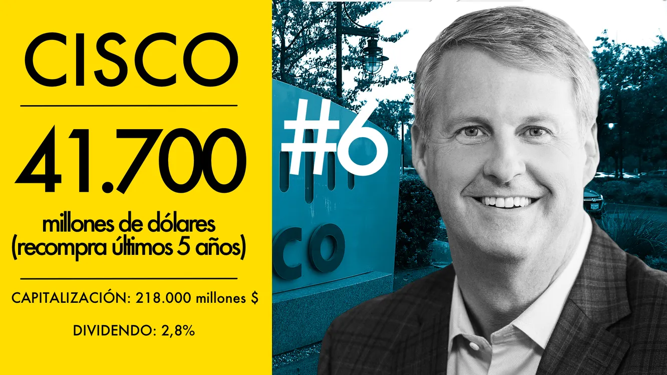 Cisco anunció un aumento de 25.000 millones a su programa existente en febrero. Para el año final completo que finalizó el día 28 de julio Cisco devolvió a sus accionistas 23.000 millones de dólares a través de recompra de acciones y dividendos.