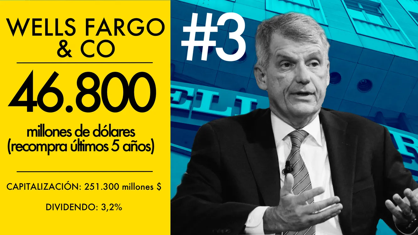 Wells fargo recompró caso 47.000 millones de dólares en sus prpias acciones en la última media década. Con la bendición de la Reserva Federal Wells Fargo anunció un aumento del 10% de los dividendos en Junio y presentó un plan de recompra de acciones de hasta 24.800 millones que se ejecutará durante los cuatros trimestres siguientes y finalizará en junio de 2019.