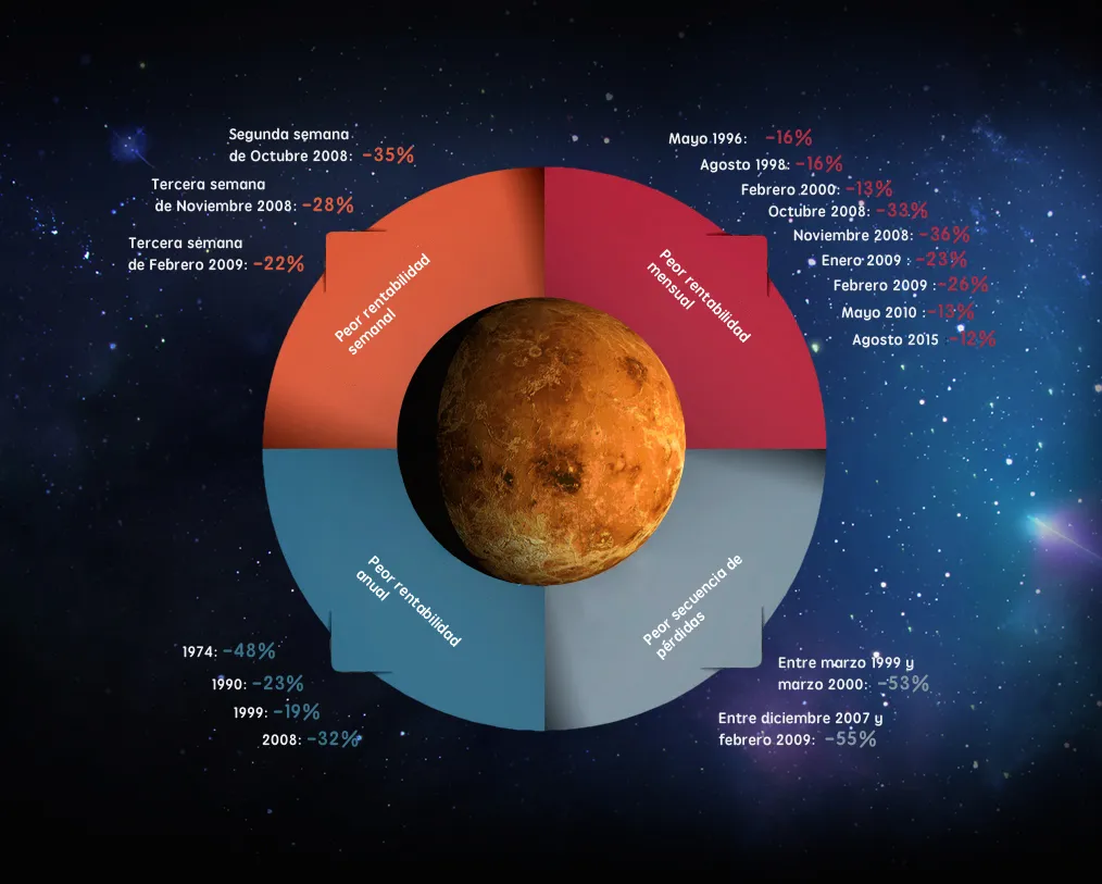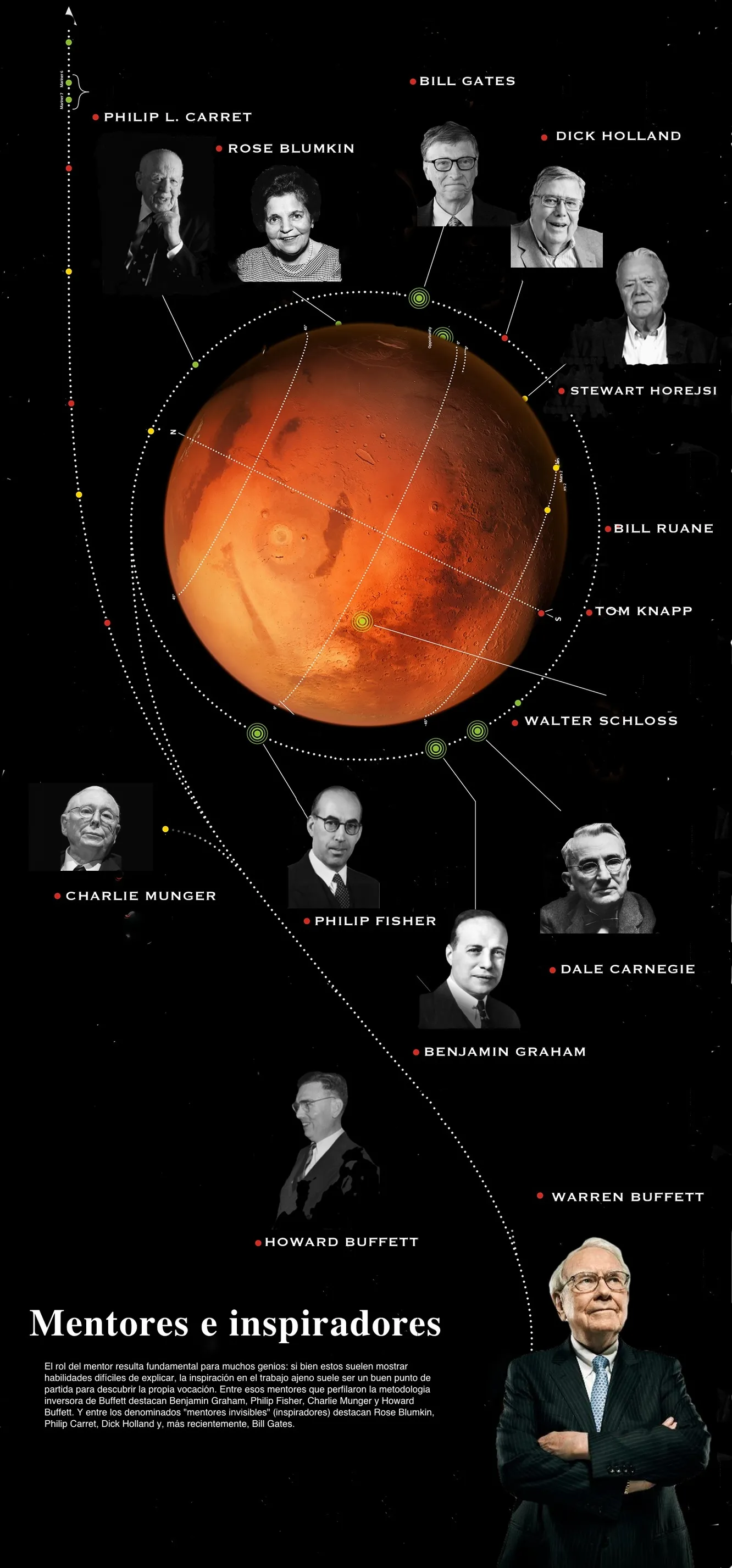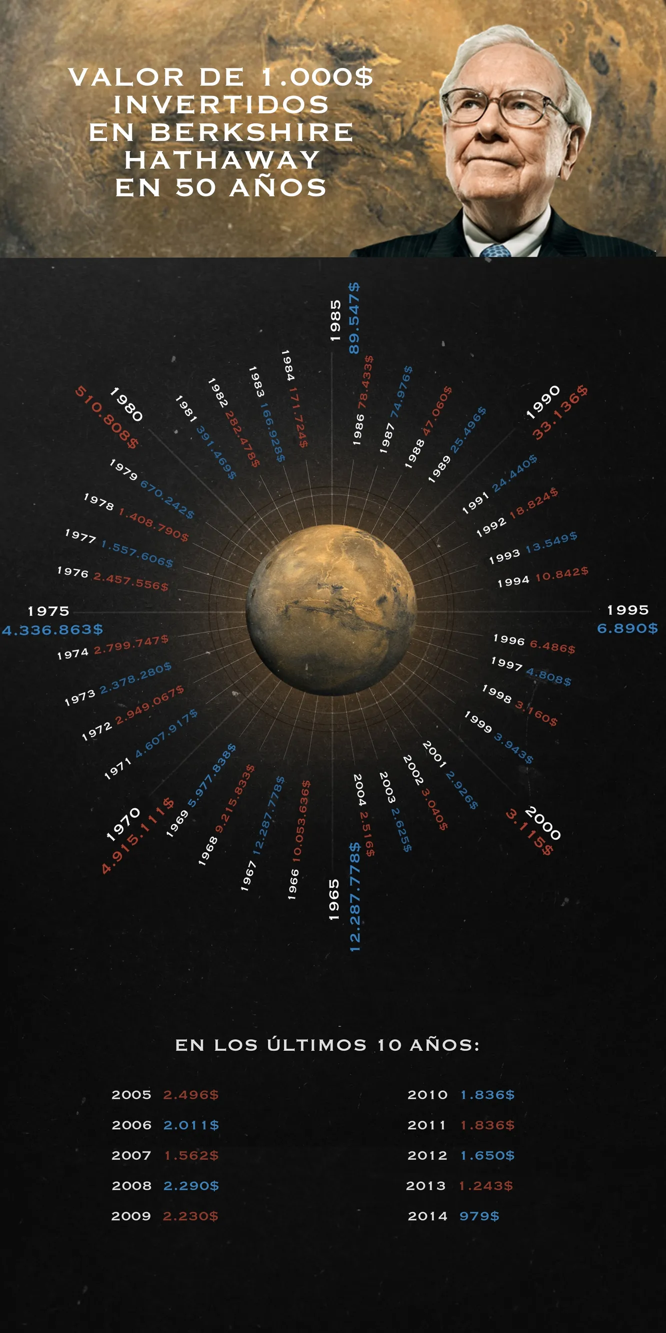 La primera década inversora de Buffett coinicide con las primeras misiones y orbitadores lanzados a Marte.Los años 1965 y 2015 son unas fechas relevantes que unen en una hermosa metáfora ambos mundos: en mayo de 1965 Warren Buffett tomó el control total de Berkshire Hathaway y dos meses después, en julio de ese mismo año, la Mariner 4 pasó por Marte ofreciéndonos las primeras fotos cercanas del planeta rojo. Ahora, en septiembre de 2015, la misión Mars Reconnaissance Orbiter (MRO) devolvió a la actualidad informativa y científica al planeta del mismo modo que unos meses antes la celebración del 50 aniversario de Berkshire Hathaway había copado la prensa financiera especializada.
