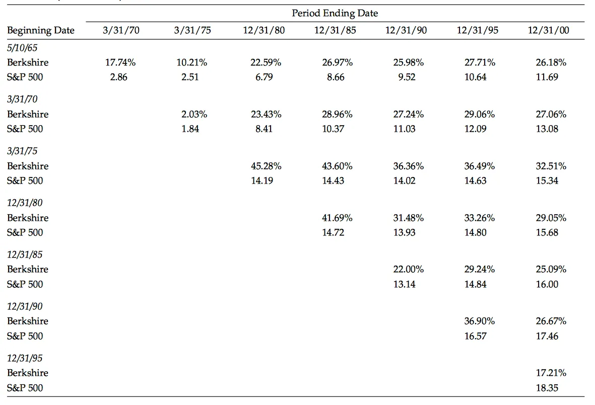 Ese ejercicio en Warren Buffett arroja conclusiones sorprendentes: 1.000$ invertidos en acciones de la clase A de Berkshire Hathaway en 1965 (cuando se hace cargo de la empresa) tendrían, a cierre de 27 de febrero de 2015 (coincidiendo con 50 años del conglomerado) un valor de 12 millones de dólares. Esos mismos 1.000$ invertidos en 1970 se hubieran convertido en la actualidad en casi 5 millones de dólares.Ciertamente a medida que avanzamos en el tiempo los rendimientos no son tan espectaculares: ese mismo capital invertido en 1980 se habrían convertido en medio millón de dólares, invertidos en 1990 se hubieran transformado en 33.000$, invertidos en el año 2000 en 2.115$ y en el año 2010 la cantidad ascendería a 1.836$.. De ello pueden dar fe accionistas fieles desde sus inicios como Dick Holland cuya primera inversión de unos pocos miles de dólares se ha transformado en 240 millones de dólares.