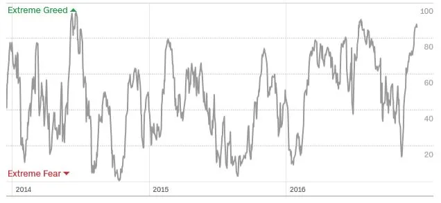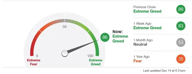 El incremento de probabilidad de retrocesos significativos también viene apoyado por el indicador "contrarian" del "Fear & Greed Index" que, elaborado utilizando 7 indicadores, muestra niveles de extrema codicia:
