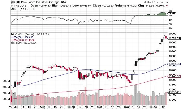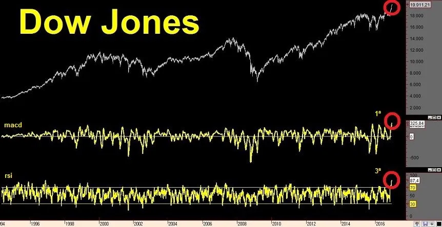 El Dow Jones se encuentra, además, en su mayor nivel de sobrecompra de toda su historia: