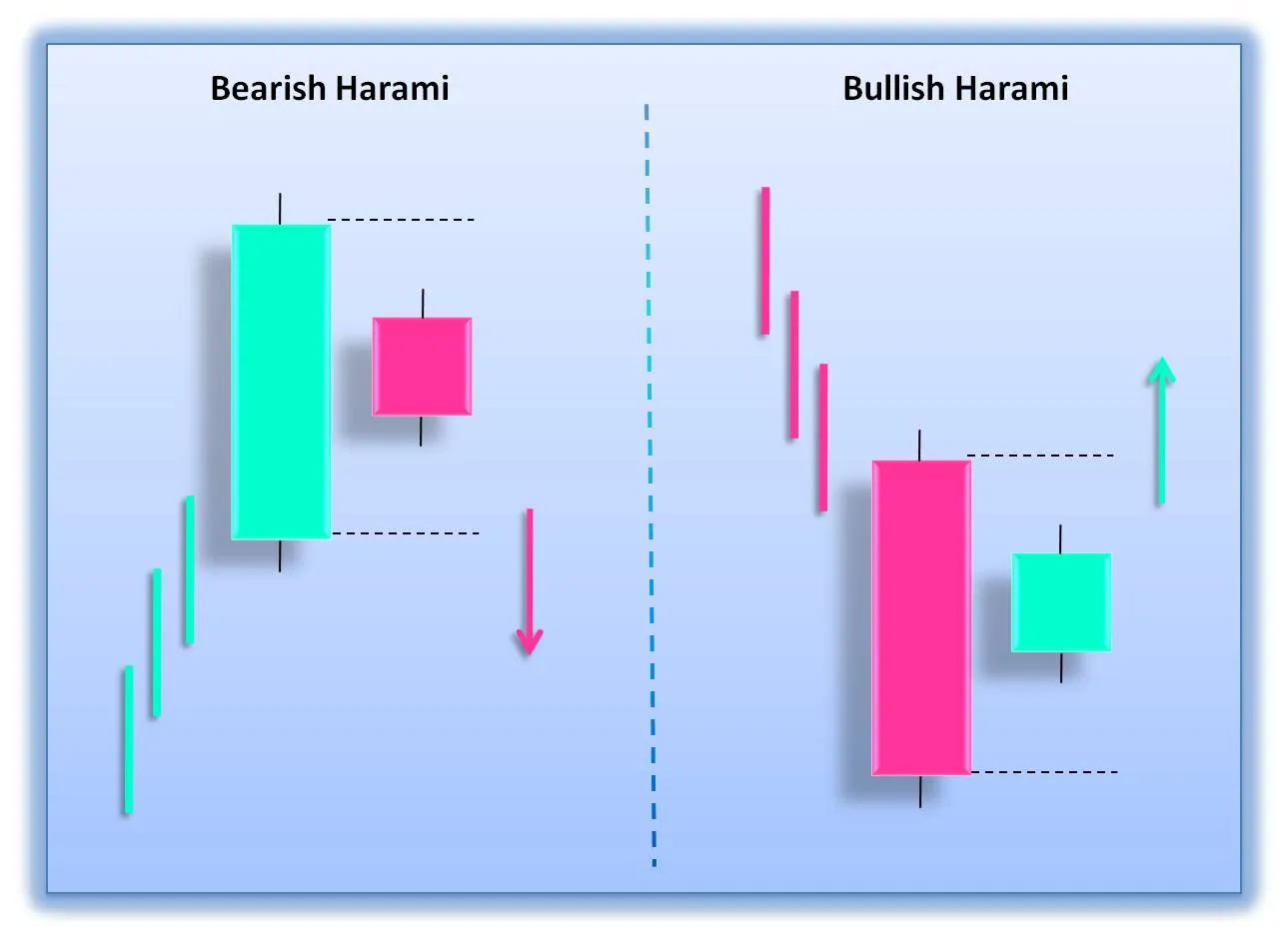 Una de las formaciones populares que muestran la mayor probabilidad de una reversión bajista recibe el nombre de "Harami Bearish" que se puede indentificar descubriendo los siguientes criterios:
