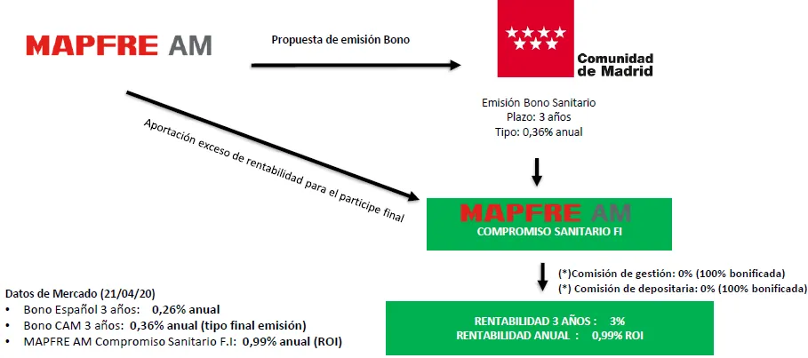 MAPFRE AM Compromiso Sanitario FI (ES0160482008), el nuevo fondo de inversión garantizado solidario, a tres años, que será comercializable a través de Mapfre Inversión desde el 28 de abril hasta el 8 de Mayo, y que tiene como activo subyacente un bono emitido por la Comunidad de Madrid destinado exclusivamente a lucha contra el COVID-19.