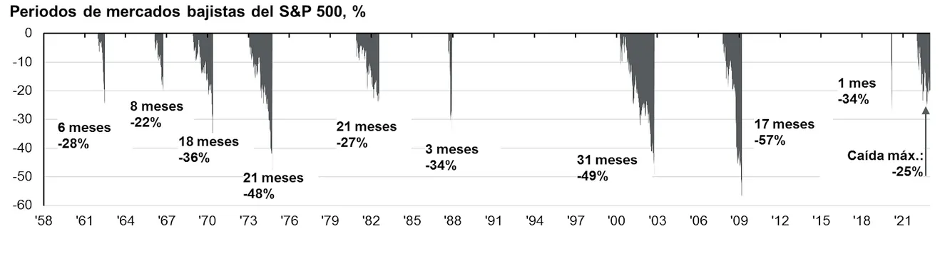 Esta gráfica muestra diferentes periodos de mercados bajistas (cuando los precios de las acciones están cayendo) en el S&P 500. Al igual que en la gráfica anterior, los periodos están representados por barras verticales con la duración en meses y el porcentaje de caída durante ese periodo. Por ejemplo, entre 1958 y 1961, hubo un mercado bajista de 6 meses con una caída del 28%. Los mercados bajistas suelen coincidir con momentos de recesión económica, incertidumbre política o financiera, y disminución de la confianza de los inversores.