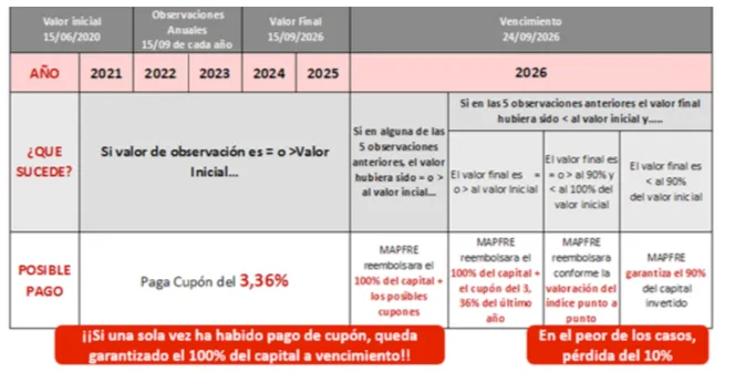 Con una sola vez de entre 6 posibles que en las observaciones anuales, el índice de referencia esté por encima del precio inicial (muy probable en el escenario actual) tendremos garantizado el 100% del capital más un cupón del 3,36%. Además cada año si el índice sigue por encima del precio inicial ganaremos cupones del 3,36%, pudiendo llegar a cobrar 6 cupones del 3,36%(20,16% de máxima rentabilidad posible)