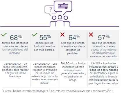 Otro de los problemas llega cuando los inversores buscan fórmulas alternativas para obtener rentabilidad en los mercados financieros. Sin embargo, todavía persisten las dudas a la hora de contratar fondos indexados. Aunque dos tercios de los encuestados (un 68%) entienden la diferencia entre inversión activa y pasiva, solo el 68% reconoce que los fondos indexados ofrecen las rentabilidades del mercado (ya sean tanto positivas como negativas) pero sin dar ningún tipo de protección en caso de que se produzcan caídas.