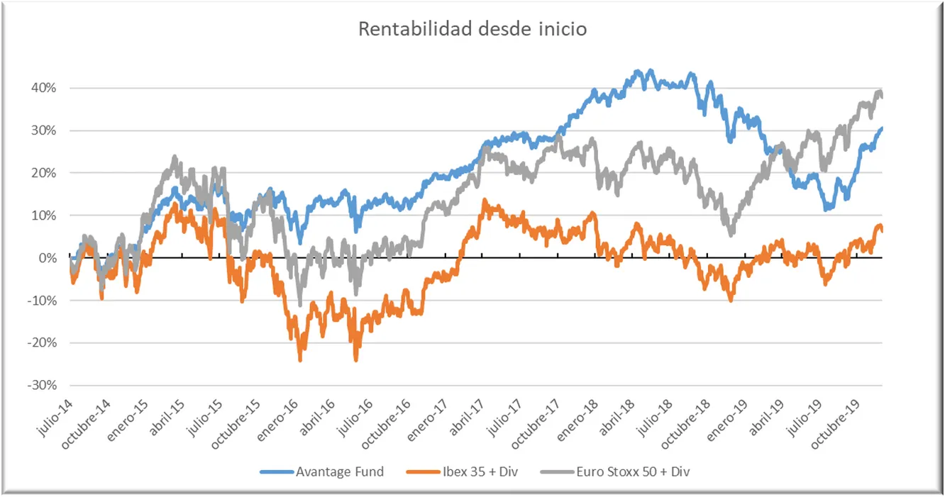 Rentabilidad desde la constitución de Avantage Fund (31/07/14) comparada con el Ibex 35 y el Eurostoxx 50 incluyendo dividendos. Hasta el 31 de diciembre de 2019