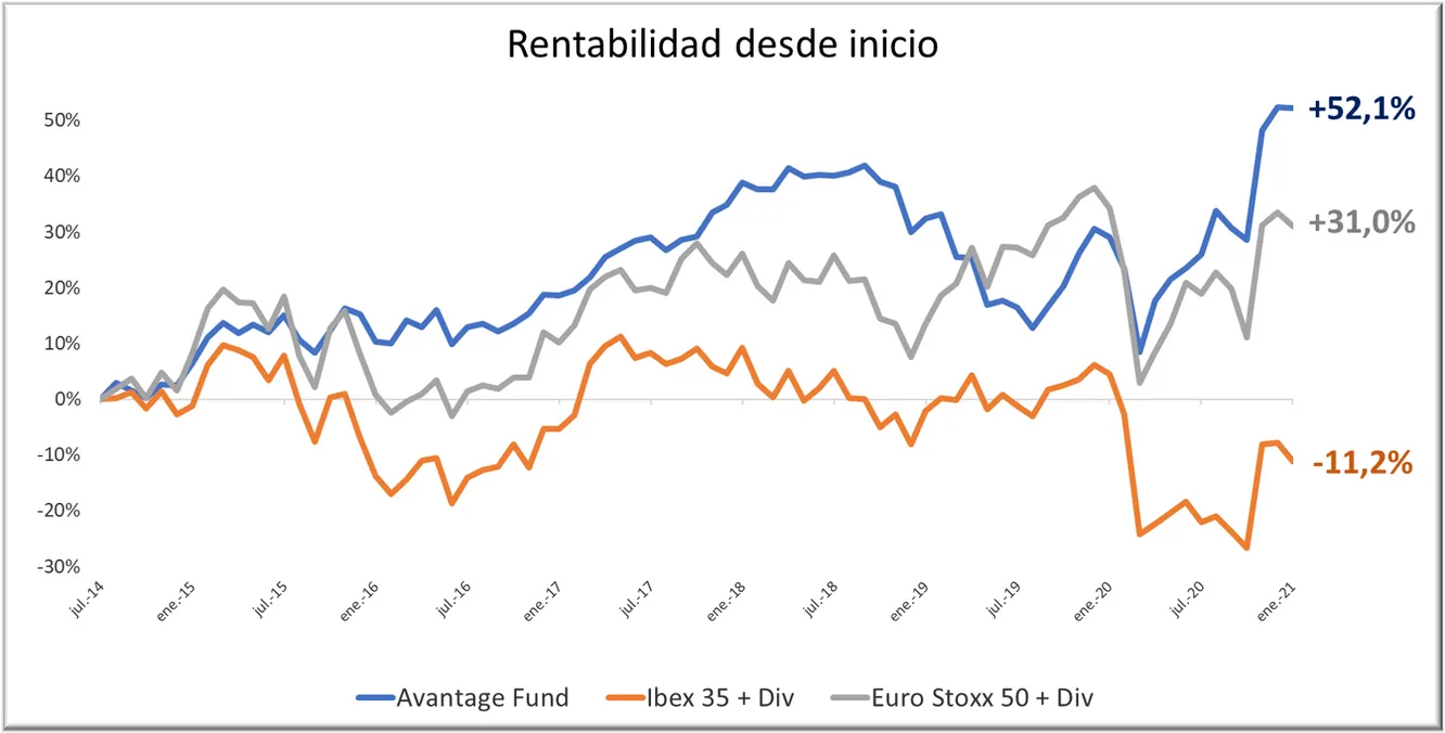 Rentabilidad desde la constitución del fondo (31/07/14) comparada con el Ibex 35 y el Eurostoxx 50 incluyendo dividendos. Hasta el 31 de enero de 2021