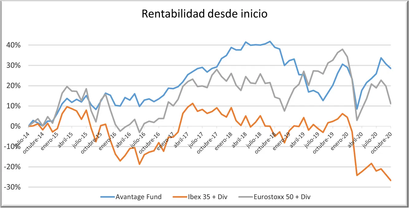 Rentabilidad desde la constitución del fondo (31/07/14) comparada con el Ibex 35 y el Eurostoxx 50 incluyendo dividendos. Hasta el 30 de octubre de 2020