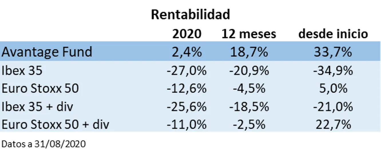 En el mes de agosto Avantage Fund se ha revalorizado un 6,2%, el Ibex 35 un 1,3% y el Euro Stoxx 50 un 3,1%. Las cotizaciones de los activos continúan moviéndose al son de las noticias referentes a la pandemia y al nivel de actividad económica que se puede mantener.