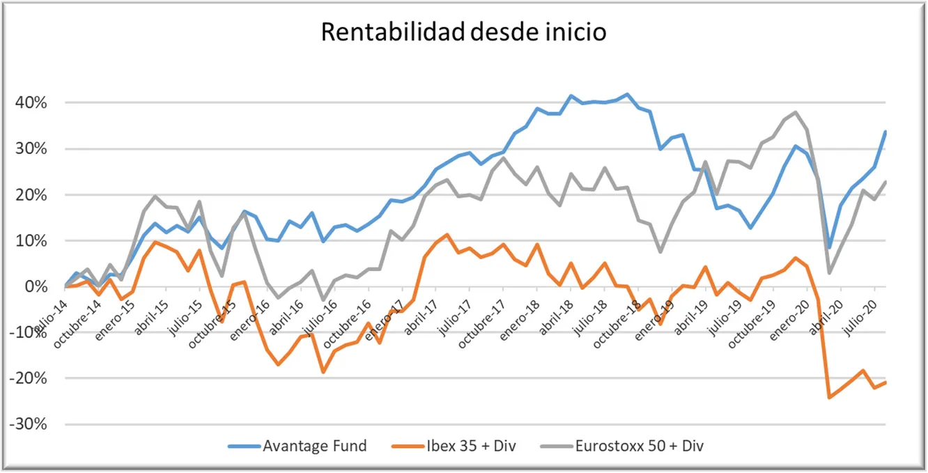 Rentabilidad desde la constitución del fondo (31/07/14) comparada con el Ibex 35 y el Eurostoxx 50 incluyendo dividendos. Hasta el 31 de agosto de 2020