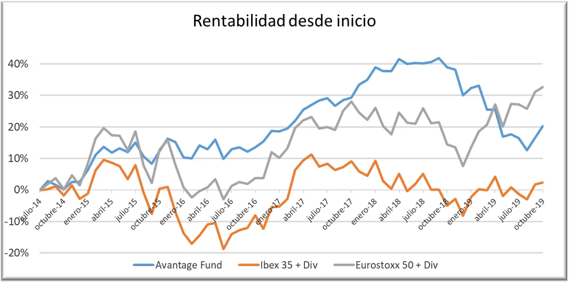 Rentabilidad desde la constitución del fondo (31/07/14) comparada con el Ibex 35 y el Eurostoxx 50 incluyendo dividendos. Hasta el 31 de octubre de 2019