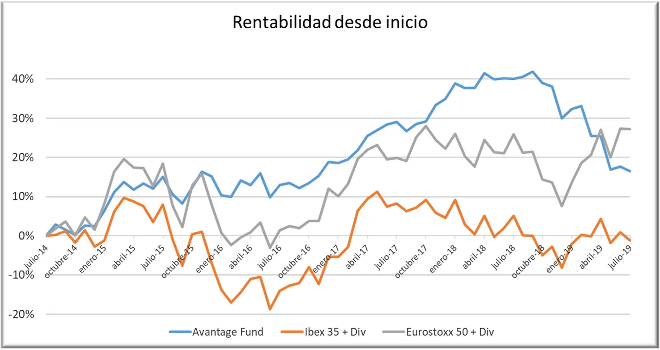 Rentabilidad desde la constitución del fondo (31/07/14) comparada con el Ibex 35 y el Eurostoxx 50 incluyendo dividendos. Hasta el 31 de julio de 2019