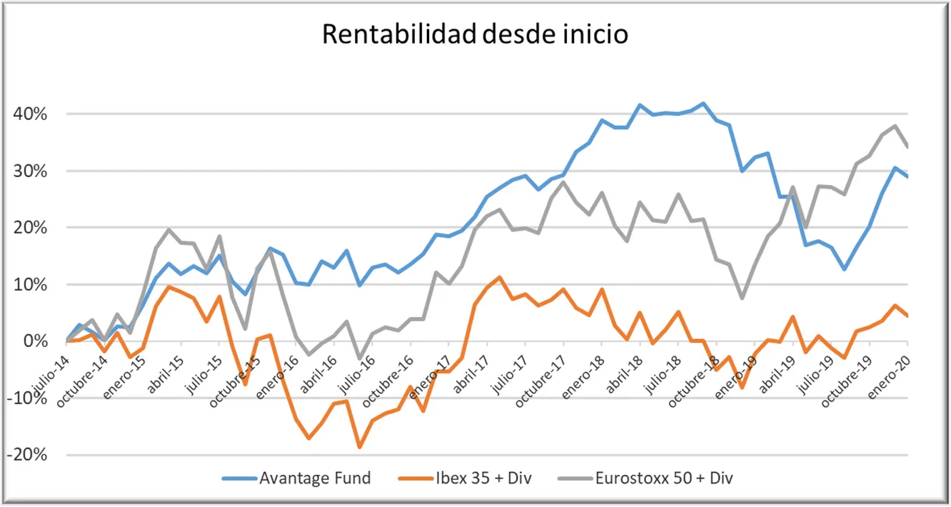 Rentabilidad desde la constitución del fondo (31/07/14) comparada con el Ibex 35 y el Eurostoxx 50 incluyendo dividendos. Hasta el 31 de enero de 2020