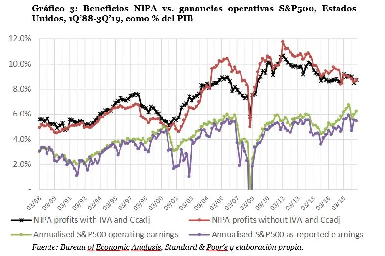 [7] La mayor diferencia entre los beneficios NIPA de la contabilidad nacional y los beneficios del S&P500 es que los primeros son beneficios obtenidos por empresas cuya actividad se desarrolla en Estados Unidos mientras que los segundos son los beneficios obtenidos por empresas que suelen tener operaciones internacionales. Para entender el resto de las diferencias, consultar Hodge, A. (2011), Comparing NIPA Profits with S&P 500 Profits, Bureau of Economic Analysis.