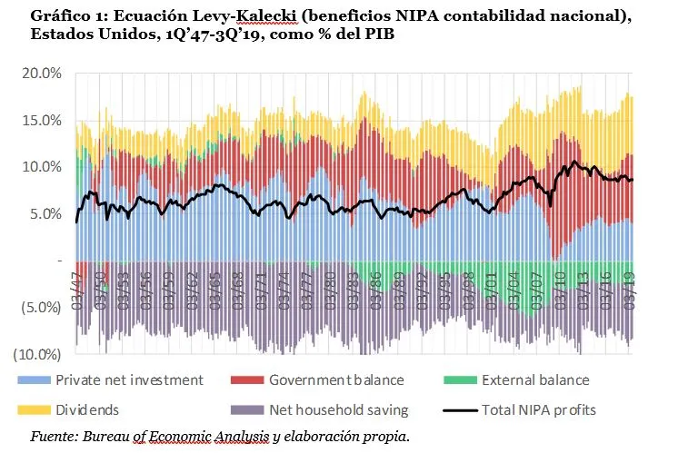 [3] Debido a su sencillez, a partir de ahora seguiremos la exposición de Kalecki, pero Jerome Levy fue el primero en llegar a la ecuación de los beneficios de manera independiente. Hoy en día, su nieto, David Levy, continúa los pasos de su abuelo al frente de su empresa, The Jerome Levy Forecasting Center, en donde hacen no solo análisis macroeconómicos de la economía estadounidense, sino también del resto del mundo. Para una explicación detallada de la ecuación de los beneficios por David, consultar su detallada explicación en su artículo Where Profits Come From.