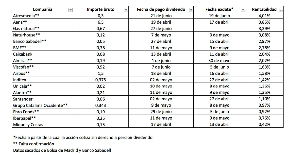 Además de las que ya están confirmadas, las estimaciones de BME y Banco Sabadell prevén que hasta final de junio repartan dividendos 18 compañías y algunas de ellas ofrecen rentabilidades interesantes. El 21 de junio Atresmedia ofrecerá a sus inversores una rentabilidad del 4% con el pago de 0,3 euros por acción, seguida en porcentaje por Aena, que repartirá un dividendo de 6,5 euros el próximo 19 de abril, lo que supone un rendimiento del 3,8%.