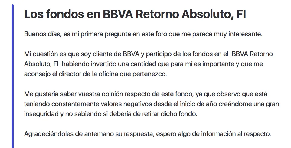 ¿Fondos de BBVA Retorno Absoluto? Por último, @Kiqe, cliente de BBVA e inversor de BBVA Retorno Absoluto, FI también ha observado que el vehículo estaba dando rentabilidades negativas, por tanto, no tenía claro si retirar toda su inversión o no.