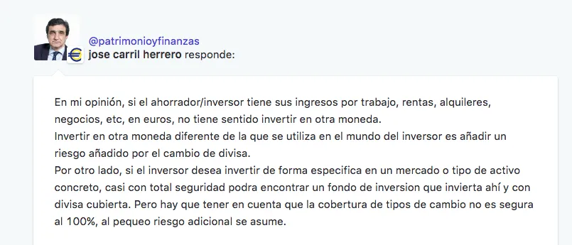 Nuestro usuario @pepovil se pregunta si es un acierto o no cubrir la divisa en sus inversiones. Actualmentre, existen numerosos productos de inversión que te permiten hacerlo, como el Allianz Global Investors Fund - Allianz Best Styles US Equity AT (H2-EUR), un fondo de riesgo 5 (para un perfil arriesgado).