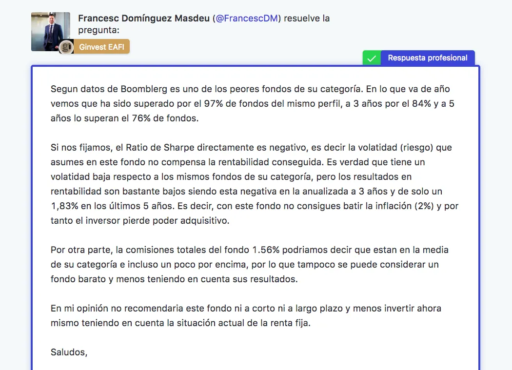 Esta fue una de las respuestas, proporcionada por Iñaki Palicio( @I.Palicio), asesor financiero: "Si no estás cómodo con el fondo de inversión, quizás deberías de preguntarte si es un producto que encaje con tu perfil de inversión. Supongo que el director de tu oficina te debería hecho un test de idoneidad antes de venderte el fondo. Dentro de esto, y comentando este fondo en particular, a pesar de que este está siendo un año muy complicado para los fondos de riesgo medio, este fondo en concreto tiene un comportamiento bastante pobre y muy alejado de otros fondos de la categoría (siempre según mi opinión personal, claro). Tienes opciones mejores por lo que te recomendaría que al menos sondearas el mercado".