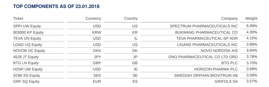 El ETFS Pharma Breakthrough GO UCITS ofrece exposición a este tipo de compañías y replica al índice Solactive Pharma Breakthrough Value, que ha acumulado un alza del 28,7% desde 2017. Además, es el único de los tres que tiene parte de su capital invertido en una empresa española (Grifols, 3,57%) o irlandesa como Horizon Pharma (3,6%). El resto está repartido entre compañías americanas, japonesas, entre otras.