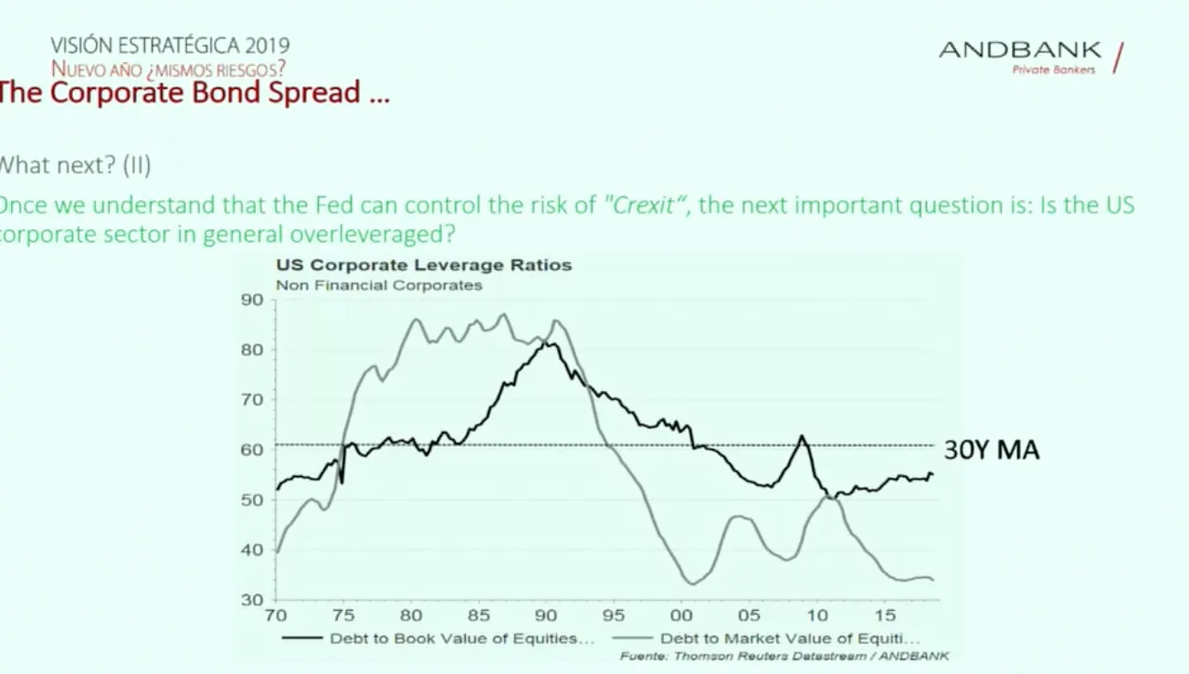 20:41 ¿Pero, la Fed podrá controlar los riesgos de este Crexit? Creemos que sí. Pero, la siguiente cuestión es ¿hay un problema en la deuda empresarial? Según el ratio deuda sobre valor contable, estamos en un nivel que no es alarmante. Además, hacemos este seguimiento pero, en lugar de con el valor contable, con el valor de mercado de dicha empresa y estamos por debajo del nivel de preocupación. Por tanto, no, no parece que haya un problema de sobreendeudamiento.