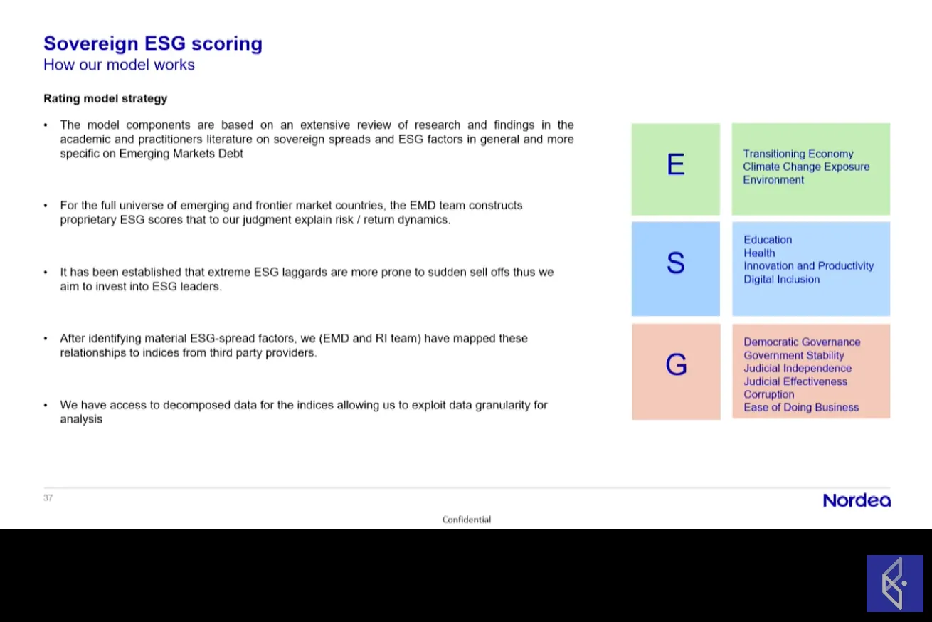15:00 "Para dar solución a productos de la renta fija, aplicamos el modelo típico de análisis por fundamentales lo combinamos con la estrategia ESG: a través de estudios académicos, aplicamos 17 puntos clave para entender por qué un bono soberano es mejor que otro. A partir de ahí, llegamos a la conclusión que se aplica a través de una clasificación A, B y C (estos últimos son los países en los que no invertimos).