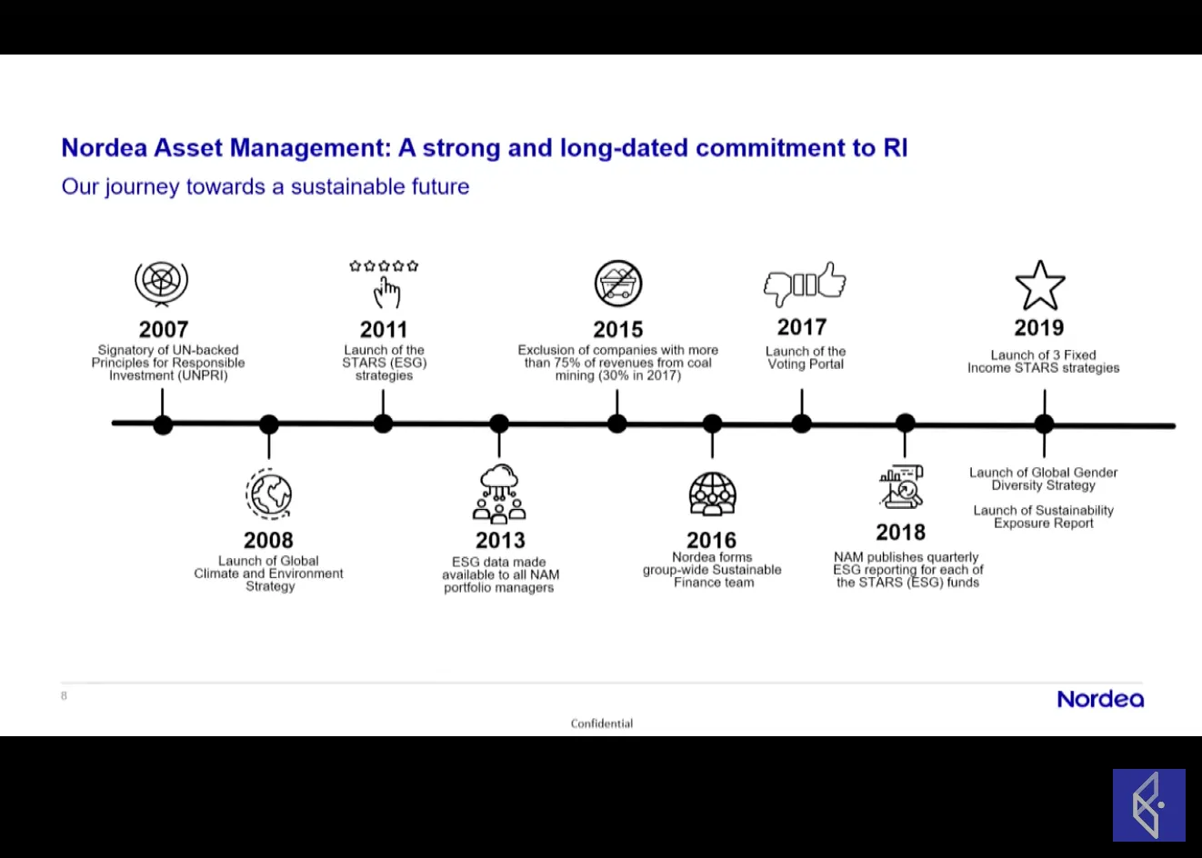 14:15 Marjo Koivisto, Co - Head of Responsble Investments, nos introduce hacia los temas ISR y el enfoque de Nordea AM. "Para muchos de los que estamos aquí, cuando firmamos los principios de la inversión responsable, solo estábamos unos 150 grupos que los adoptamos. El número ha crecido unas 10 veces desde 2007. Sin duda, es muy alentador, ya que nos estamos concienciando cada día más del impacto de esta estrategia, tanto para las rentabilidades como para el planeta".