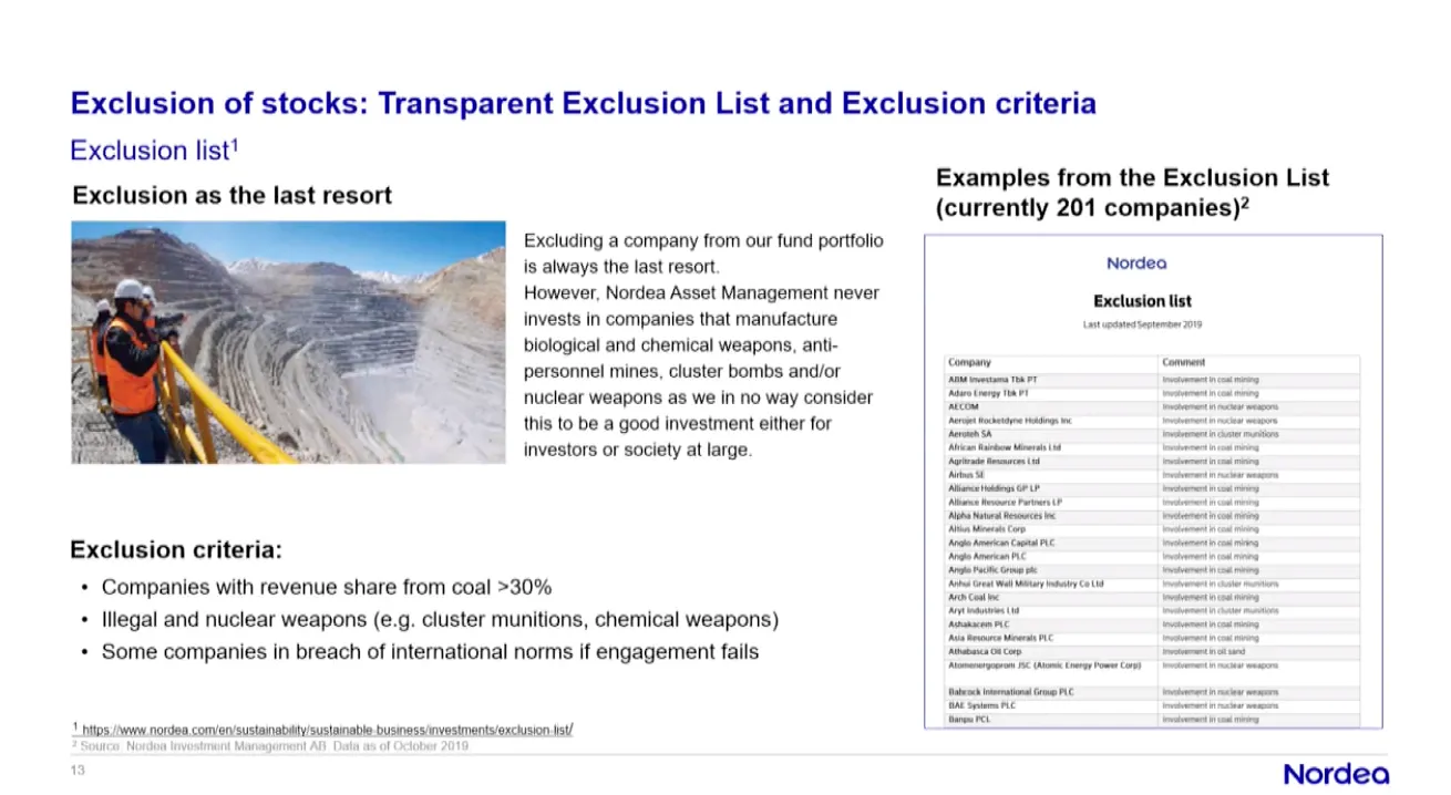 14:30 "No es fácil la exclusión. Para nosotros es el últimos recurso, ya que creemos que la forma de influir es hacerlo de abajo a arriba. No obstante, tomamos la decisión de ser estrictos con las empresas de minas de carbón o empresas que tienen más del 30% de sus ingresos por esta actividad. Tampoco invertimos en armas nucleares o ilegales".