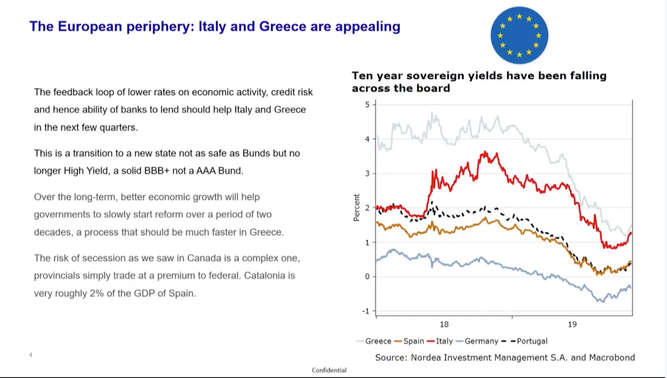 9:26 "Si nos centramos en la periferia, hay oportunidades en la duración. Por ejemplo. Grecia e italia se podrían operar como un 'BBB'.