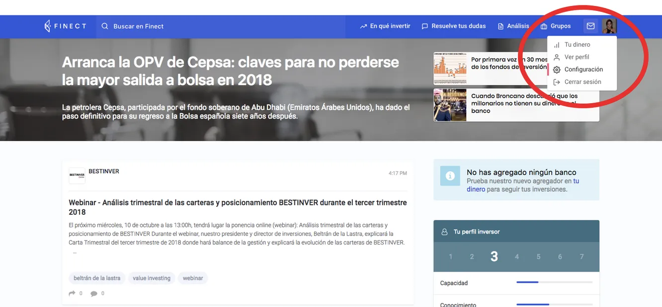 2) Ir a 'Configuración. Una vez que hayas creado el usuario, o si ya lo tenías, debes ir a la configuración de tu perfil. ¿Cómo? En la 'home' de Finect, margen superior derecho, tienes que clickar en tu foto de perfil (o en el avatar en gris si no has subido una foto).