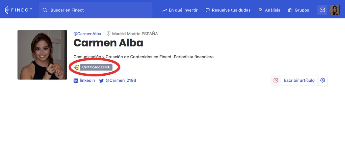 Además, en tu perfil personal también aparecerá el distintivo de 'Certificado EFPA' junto al logo, tal y como aparece en la imagen de abajo. Espero que la información te haya resultado útil. Si tienes cualquier duda, puedes plantearla en los comentarios.