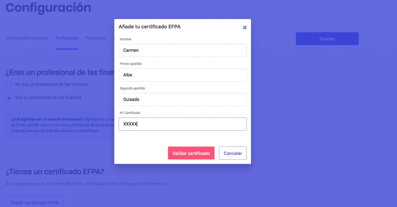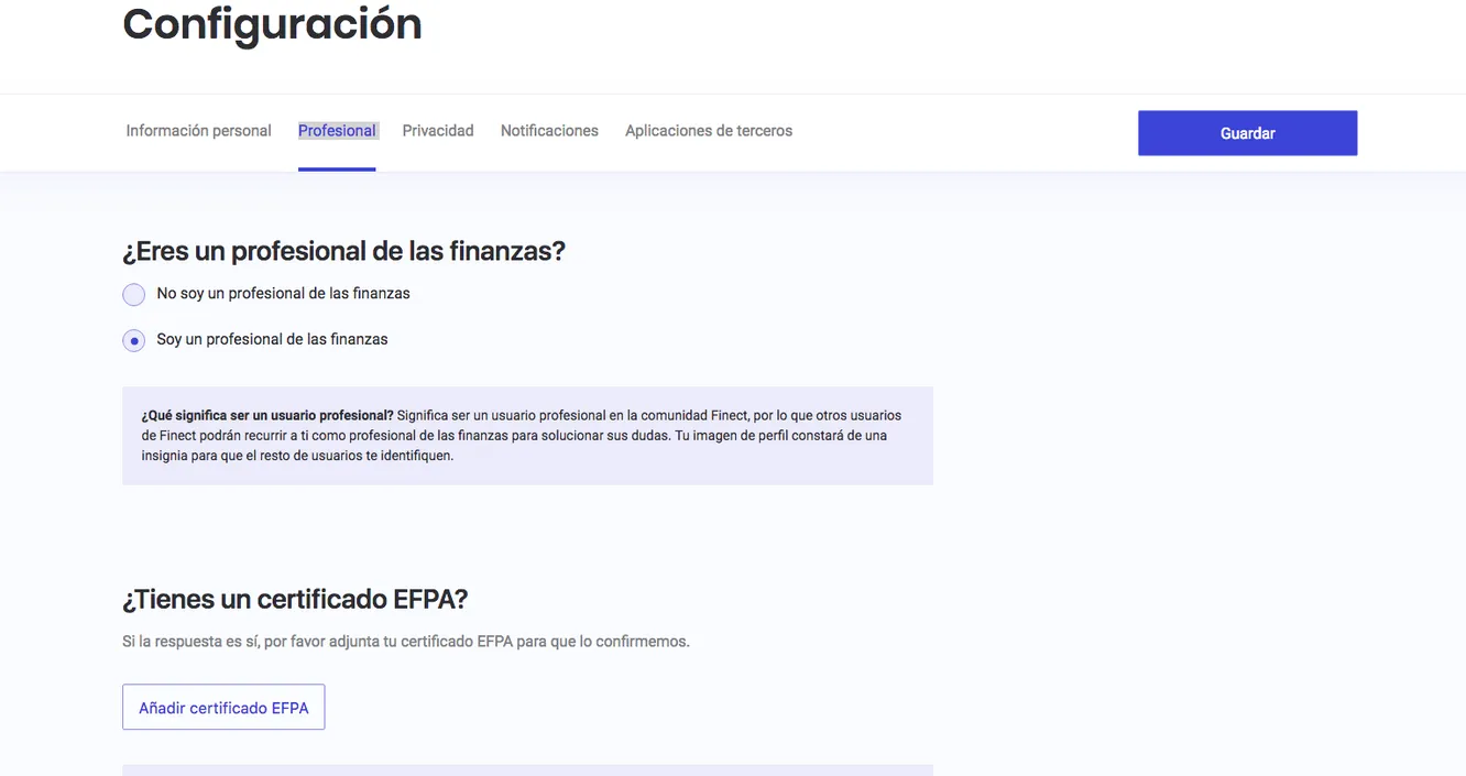 5) Añade tu certificado EFPA. En este apartado, tienes que responder a dos preguntas: por un lado, ¿eres un profesional de las finanzas? En la que solo tendrás que poner 'sí' o 'no', según se corresponda. Como asesor que eres, te recomiendo que respondas con un sí esta cuestión, ya que recibirás información específica para profesionales.