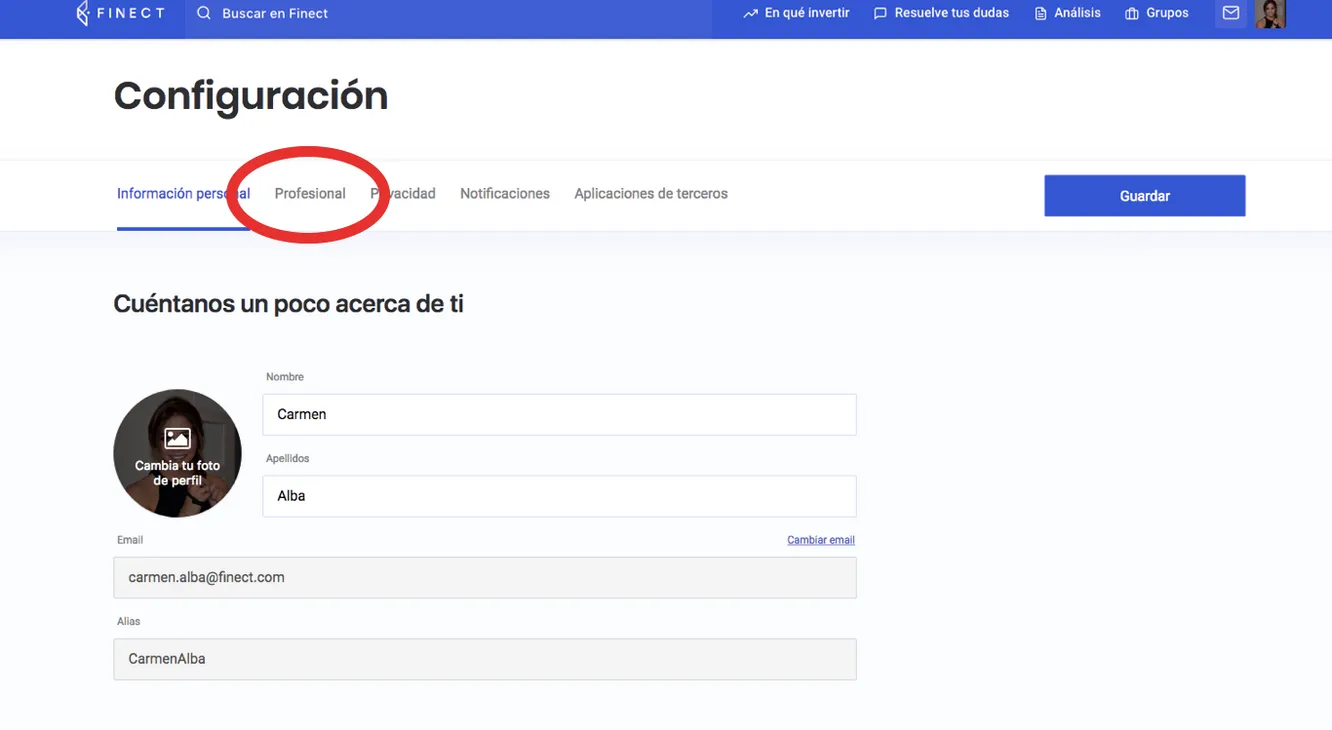 4) Después, debes seleccionar la pestaña 'Profesional'. En tu perfil, además de la información personal, también tienes la opción de rellenar los datos profesionales, configurar tu privacidad, así como las notificaciones que quieres recibir. Para el certificado EFPA tienes que seleccionar la pestaña 'Profesional'.