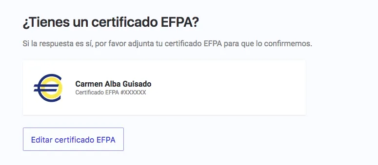 Por último, la segunda pregunta es ¿Tienes un certificado EFPA? Aquí tendrás que rellenar los siguientes campos con la misma información que aparece en la página oficial de EFPA. ¡Ojo! Esto es muy importante, ya que si pones algún dato incorrecto o diferente a como aparece en su web, te dará error.