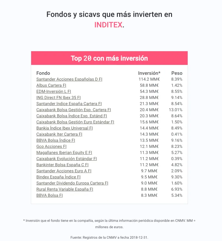 A continuación, os dejo una lista de los fonfos y sicavs que más invierten en Inditex a cierre del cuarto trimestre de 2018.