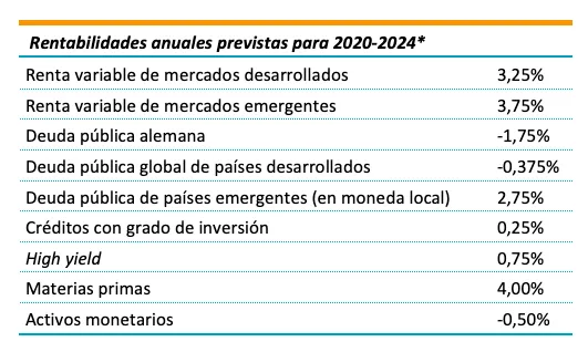 Asimismo, han revisado a la baja sus previsiones de rentabilidad para la mayoría de las categorías de activos a cinco años vista. En deuda pública, las perspectivas para los próximos cinco años son dispares:
