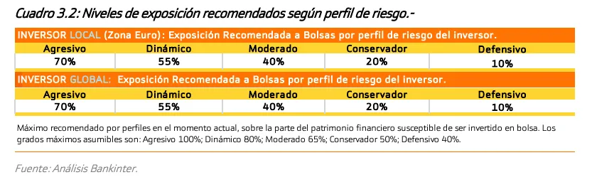 En la tabla inferior aparecen los niveles de exposición recomendados por cada perfil de riesgo del inversor, según la entidad.