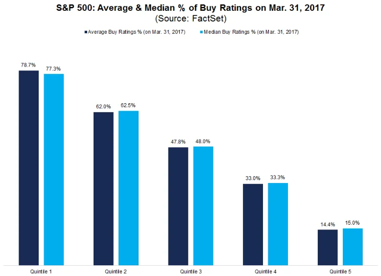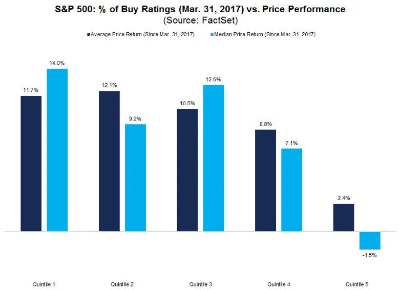 ¿Aciertan o no las recomendaciones de los analistas? Para comprobarlo, FactSet ha dividido las compañías del S&P 500 en cinco categorías distintas, de mayor a peor recomendación de compra: las empresas del primer grupo cuentan de media con más de un 78% de recomendaciones de compra, frente al quinto grupo, que solo tiene el 14,4%.