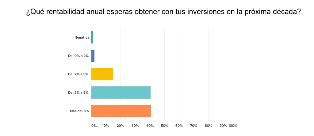 A raíz de este artículo, y de muchos comentarios en redes que decían que la rentabilidad media que usamos en el ejemplo era excesiva (a efectos ilustrativos, del 10% anual, aunque también hemos usado en otros casos un 7%), nos surgió una duda: ¿En realidad, qué rentabilidad a largo plazo esperamos los inversores en nuestras carteras? Así que decidimos preguntaros directamente.