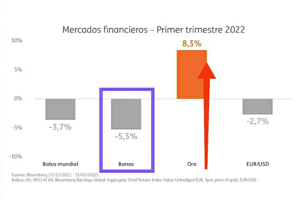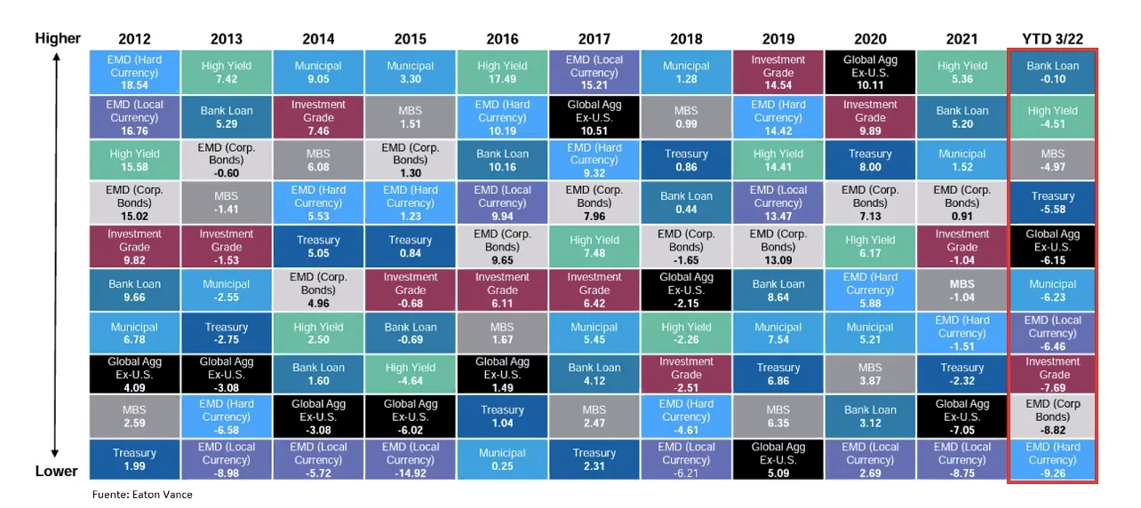 De hecho no hay ningún activo de renta fija que esté en positivo este ejercicio. Si te fijas en el cuadro de más abajo en el última de las columnas, ya sean bonos globales, americanos, high yield… TODOS EN NEGATIVO, y a ti tu banco te dijo que la renta fija era segura…