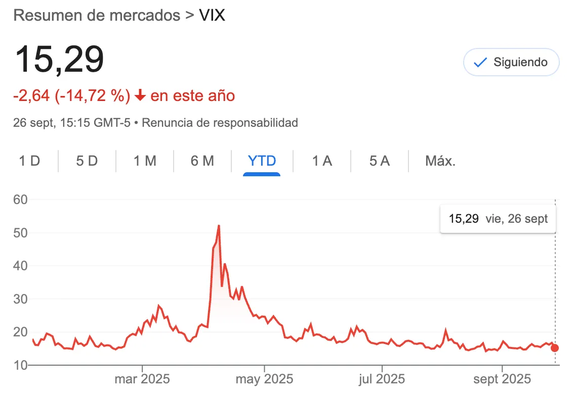 El VIX, conocido como el “índice del miedo”, mide la volatilidad implícita en las opciones sobre el S&P 500, es decir, refleja las expectativas de los inversores sobre la inestabilidad futura del mercado. Un VIX elevado suele asociarse con pánico o incertidumbre, mientras que un VIX bajo indica confianza y estabilidad. Hoy se encuentra en niveles mínimos, lo que demuestra que, a pesar de los titulares alarmistas, los mercados no están anticipando un escenario de crisis global inminente.