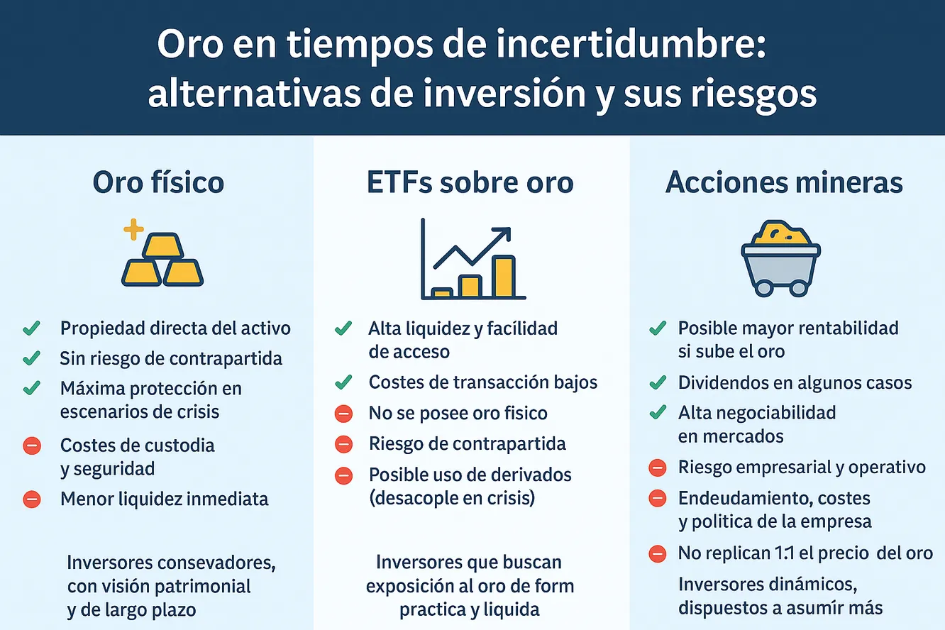 - No todos los ETFs están completamente respaldados por oro físico; algunos recurren a derivados, lo que puede derivar en un desacoplamiento respecto al precio real en situaciones de estrés de mercado.