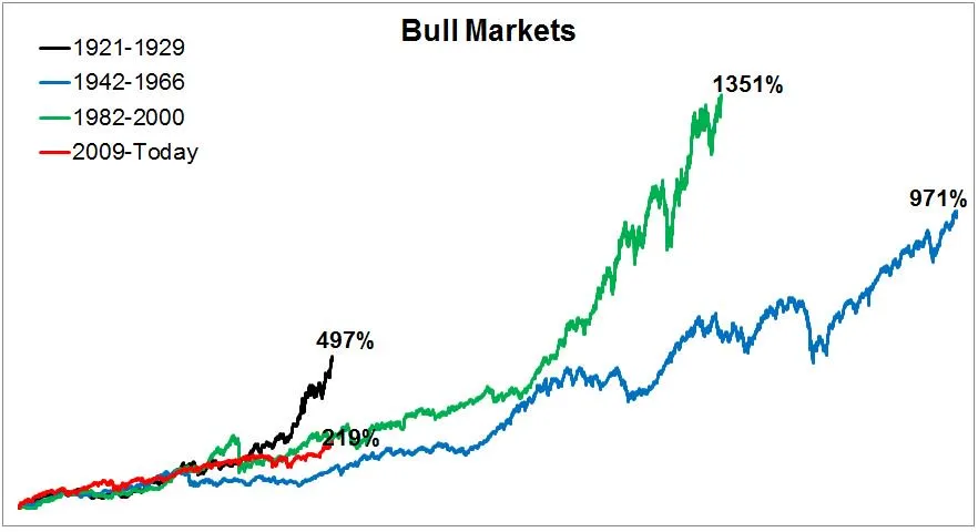 En el último artículo de Michael Batnik aparece un gráfico interesante donde se comparan la duración y la dimensión de los mercados alcistas en USA (mercado alcista actual = línea roja)