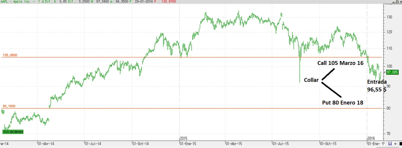 Completo el collar, que es el nombre de esta estrategia alcista, con protección, vendiendo una Call 105 03 2016, que está fuera del dinero, es decir, con precio de ejercicio poco menos del 9% encima del precio actual, y vencimiento cercano (Marzo 2016).