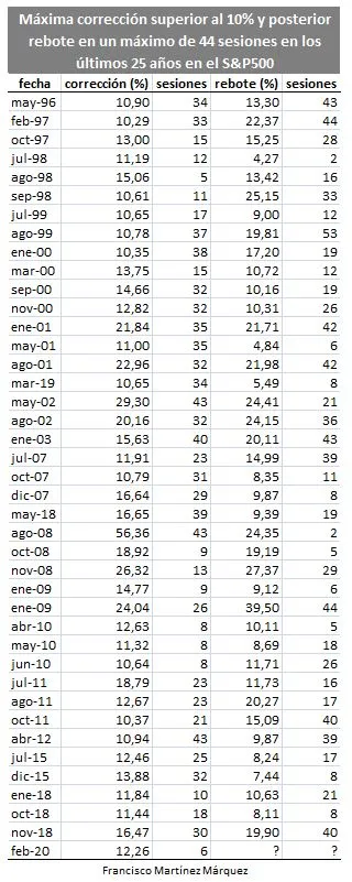 Si estás en este último caso te dejo una tabla que muestra las mayores correcciones del S&P 500 superiores al 10% y posterior rebote, en un máximo de 44 sesiones (cada movimiento), desde 1995.