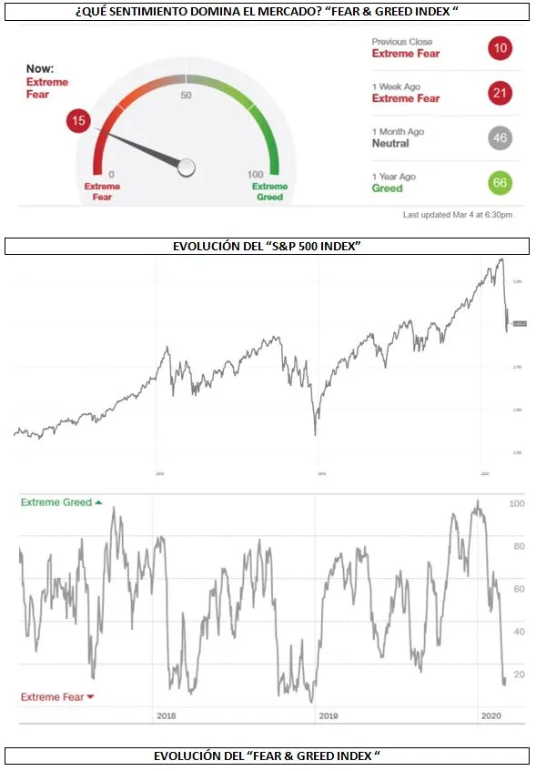 Hoy las bolsas corrigen dentro del movimiento pendular que siguen esta semana, mostrando un comportamiento típico de momentos de alta volatilidad (por cierto, el VIX es uno de los indicadores empleados para el cálculo del “Fear & Greed Index”). En este punto conviene recordar el sentimiento que domina el mercado y contextualizar su evolución con la del S&P 500 (otra serie empleada en el cálculo) en los últimos tres años.