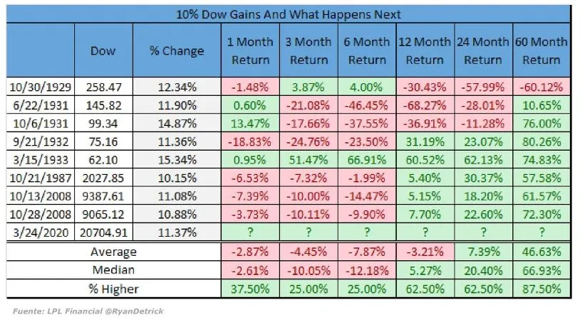 Si echamos la vista atrás y nos fijamos en las subidas de más del 10% en una sesión en el Dow, y vemos lo que ha ocurrido en los siguientes 1, 3, 6, 12, 24 y 60 meses con los retornos, podemos sacar alguna conclusión interesante:
