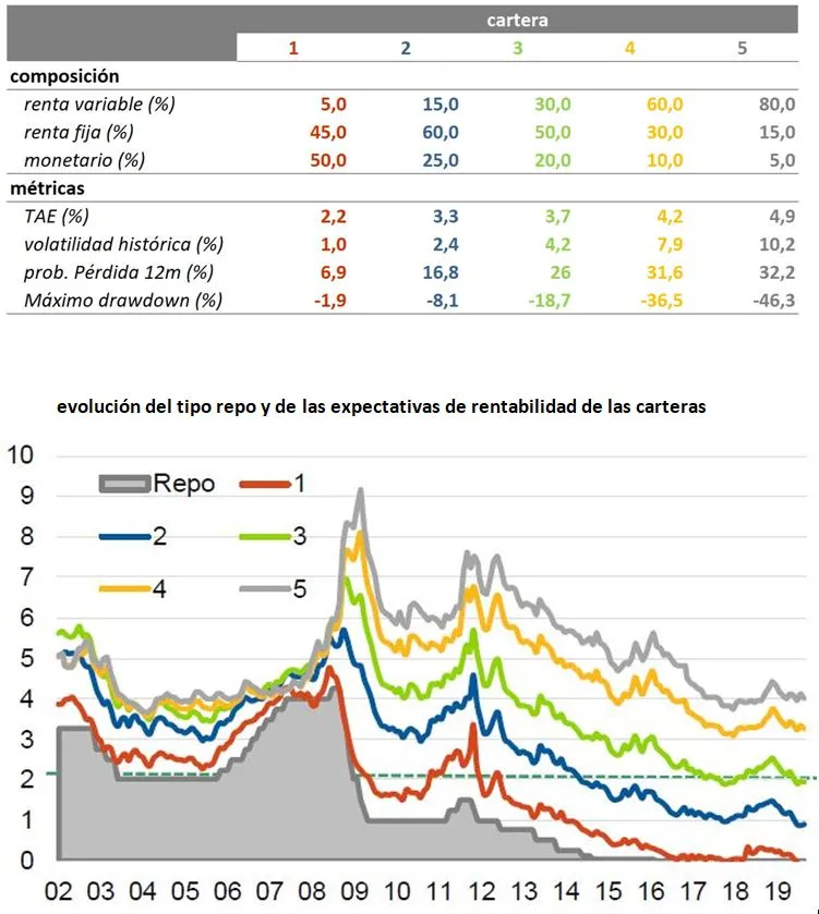 En los últimos años el patrimonio en Fondos de Inversión ha ganado terreno a los depósitos como activo financiero con mayor volumen. Según datos del observatorio de Inverco, 16 provincias superan el 30% del ratio Fondos de Inversión/depósitos, encabezando el ranking Teruel (46,7%). Y es que para mantener unas expectativas de rentabilidad del 2% (tomando como referencia el ejemplo de las 5 carteras de la imagen y el objetivo de inflación del BCE), y por tanto, preservar el patrimonio, se debe aumentar el peso en renta variable del 5% al 30%, lo que implica un aumento de: